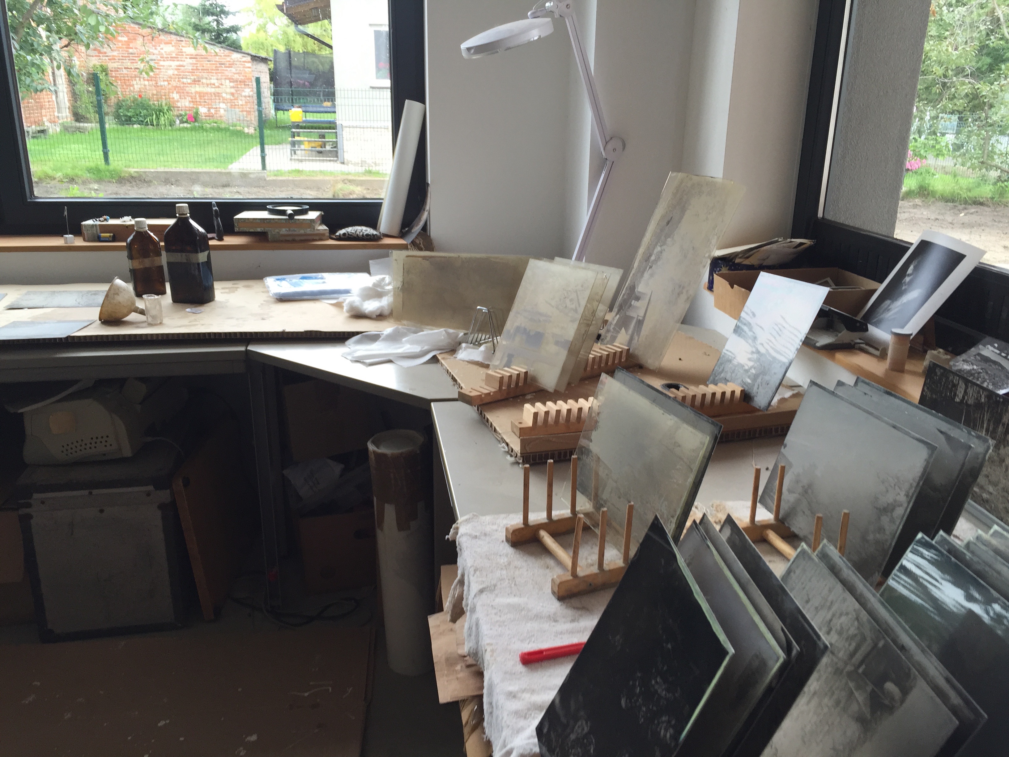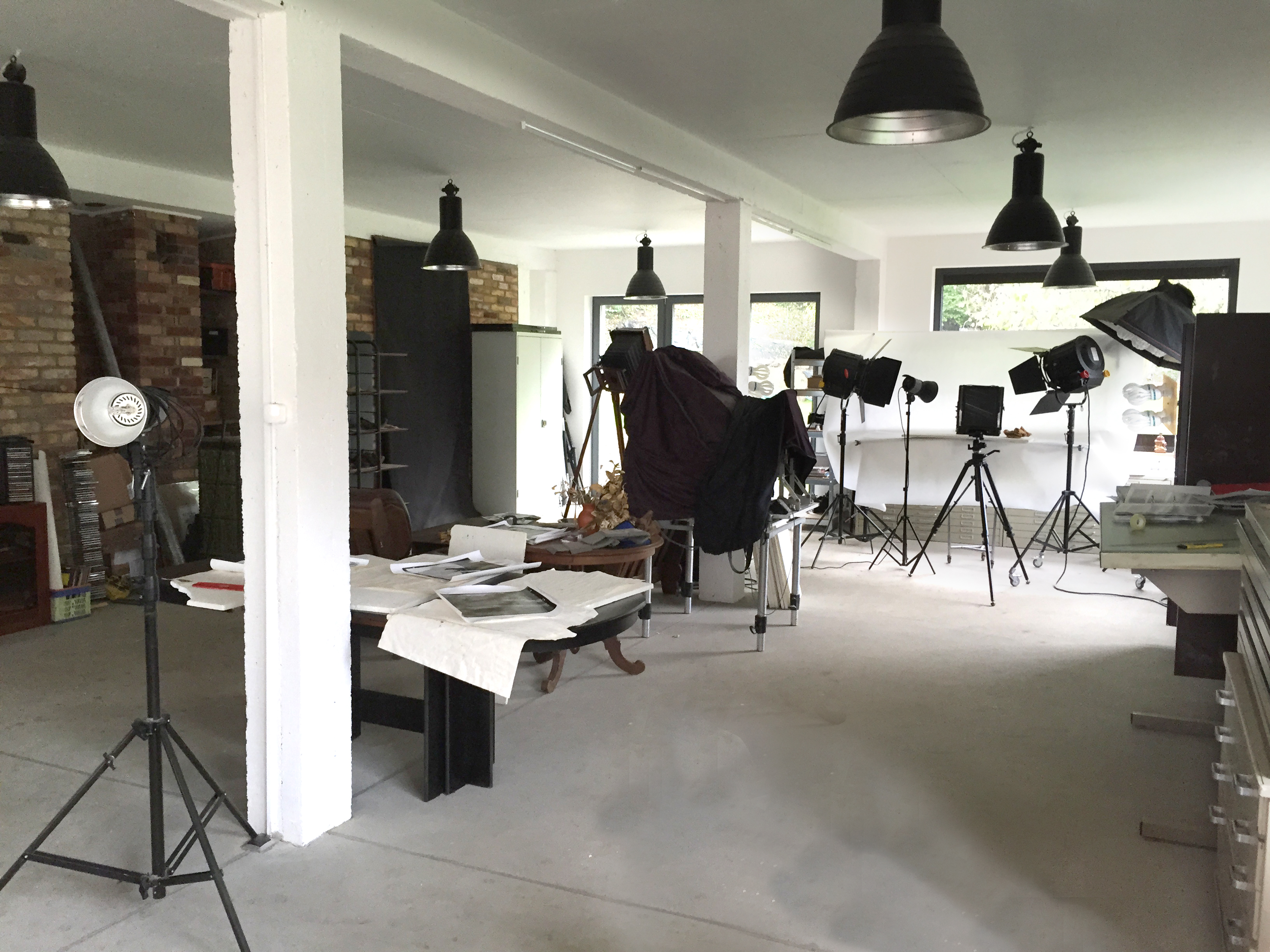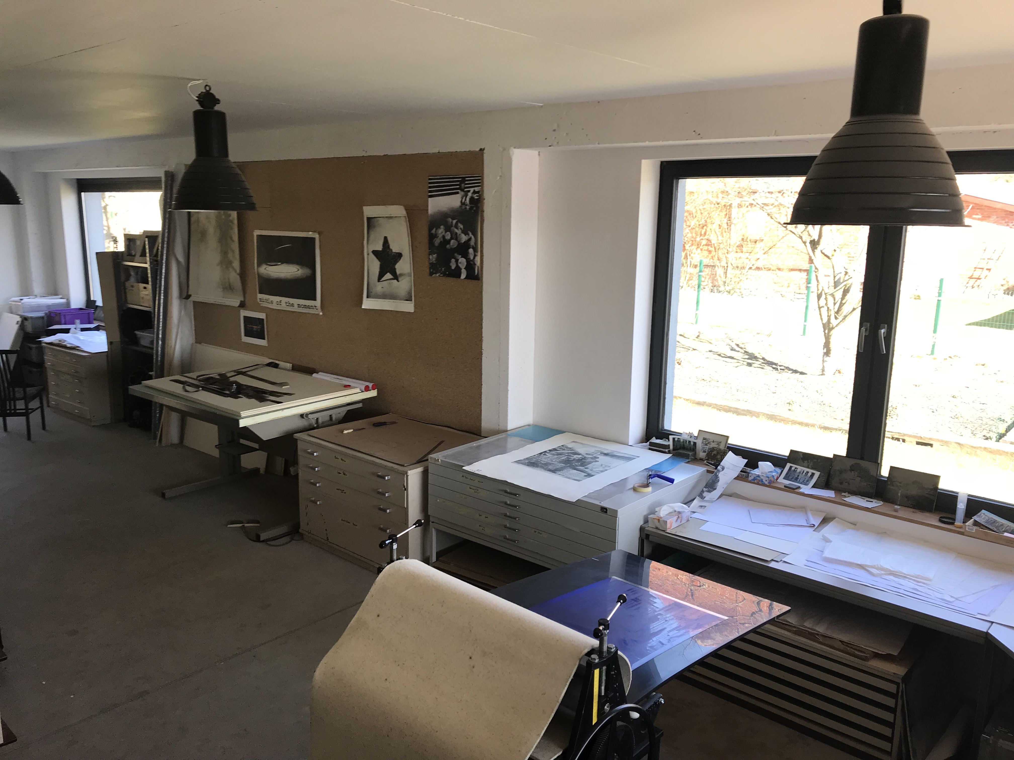 Eingerichtet für Fotoaufnahmen und einer Tiefdruckpresse zum erstellen von Druckgrafiken.
